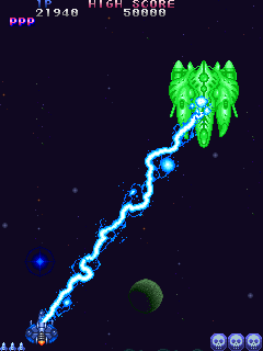 슈팅스타일은 3가지인데, 기본3방향의 붉은색 총알과 유도탄같이 적을 알아서 타겟 잡는 푸른레이저, 그리고 녹색의 관통탄인데, 기본장착탄인 붉은색 탄환이 부채꼴로 범위가 퍼지는데다가 공격판정도 좋기때문에, 특수한 경우 외엔 거의 붉은탄환으로 많이들 플레이했던걸로 기억한다. 특히 푸른레이저는... 보기엔 매우 화려하고 강력해보이는데, 막상 써보면, 그리 강력한것도 아닌데다가 쓸데없는데 조준이 되어 난감할때가 많다보니, 실수로라도 먹으면 짜증이 난달까?