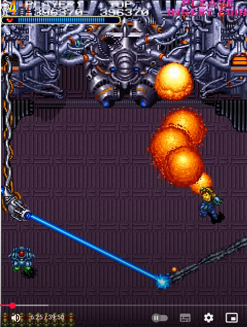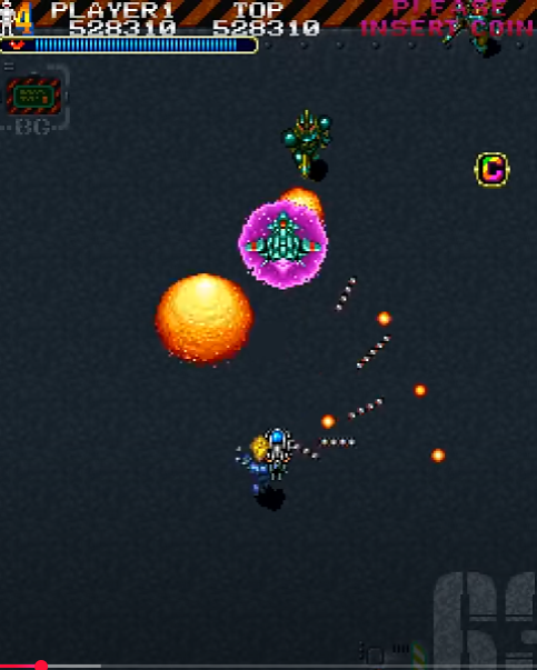 좌우간, 시원시원한 슈팅, 폭탄을 사용하면 화면전체의 적이 시원스레 순삭되는 쾌감등은... 영락없는 트윈코브라, 플라잉샤크의 스타일에서 따온 느낌을 지울수 없었는데, 필자가 이 게임에서 강렬한 인상을 받았던 무기는 역시나, 원형으로 돌며 적을 공격하는 철퇴(?) 스타일의 무기였다. 아니 근데.. 지금에서야 안건데... 정지화면으로 보니 저게 철퇴가 아니라 왠 전투기가 안에 있...