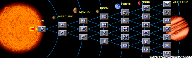 각 구간을 골라서 갈수 있는 선택형 스테이지 진행... MSX의 가딕 이라는 게임에서 이미 비슷한 컨셉을 선보였었는데 사실, 어딜 선택하나 별반 크게 어렵다거나 쉽다거나 하는 느낌은 거의 없었던 걸로 기억한다. 다만 나오는 배경과 등장하는 적들의 움직임 패턴이 다른 정도... 나중엔 한번 가봤던 스테이지만 계속 가게 되는 경향이 있다.ㅎㅎ